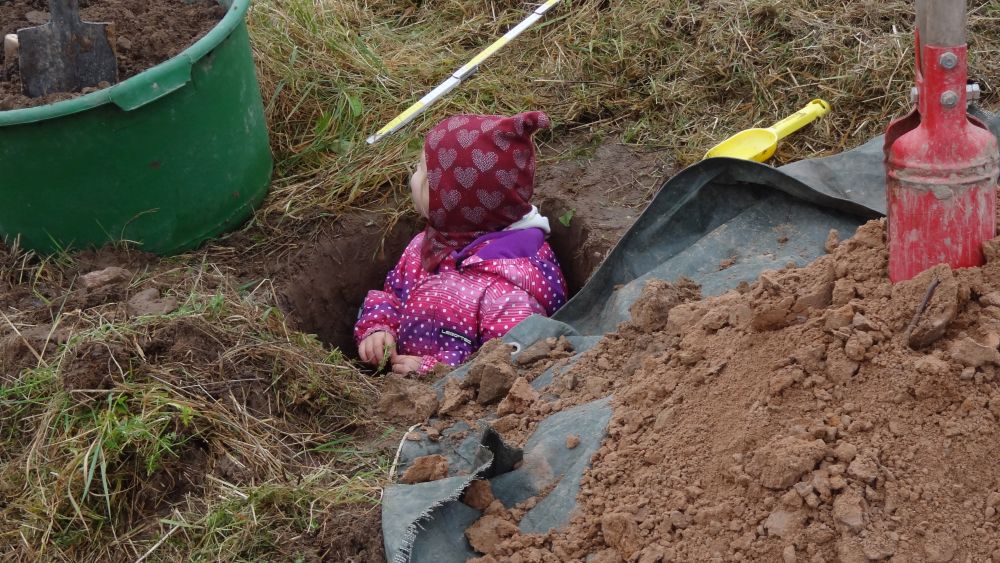 Unsere Tochter Leonda freut sich bei jedem frisch gegrabenen Loch zu prüfen, ob es schon tief genug ist: